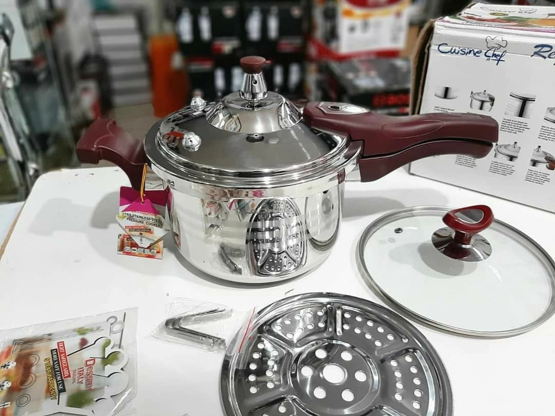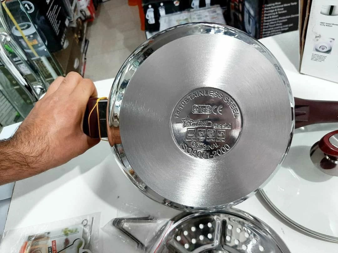 استیل ضد زنگ دارای سوپاپ اطمینان واشر سیلیکونی مخصوص کفی سه لایه برای انتقال بهتر حرارت دارای یک سبد برای بخارپز دارای سیستم تخلیه فشار جهت تامین حداکثر انرژی سیستم زنگ خطر حفظ ویتامین مواد دارای قفل امنیت